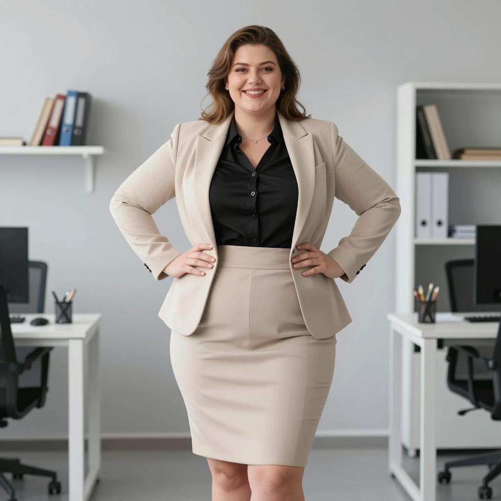 Office outfit chubby woman, photograph of a confident, plus-sized woman with fair skin and brown hair, standing in a modern office, wearing a beige blazer and matching skirt, black blouse, hands on her hips, smiling, neutral gray background, white shelf with books and papers in the background, professional attire, realistic style, studio lighting, full-body shot