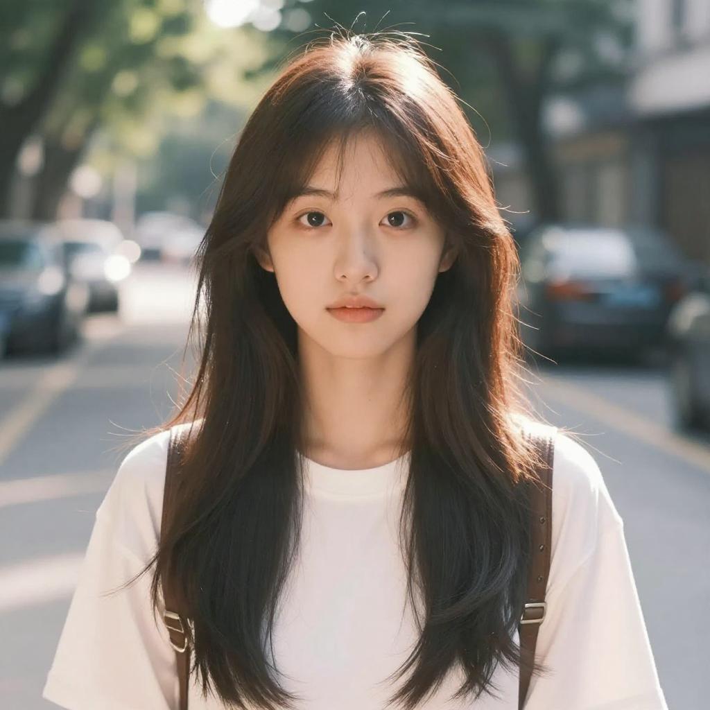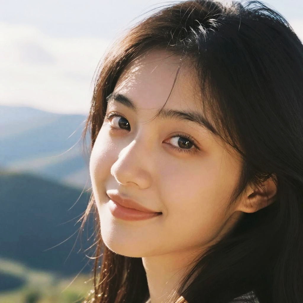 High quality, masterpiece, (realistic, photo-realistic:1.2), high definition, ultra detailed, raw photo, 1girl, detailed eyes, glowing eyes, (beautiful, aesthetic, perfect, delicate, intricate:1.2), Dark hair, dark eyes, upper body, sun flare, outdoors, mountain, valley, sky. clouds, smiling
