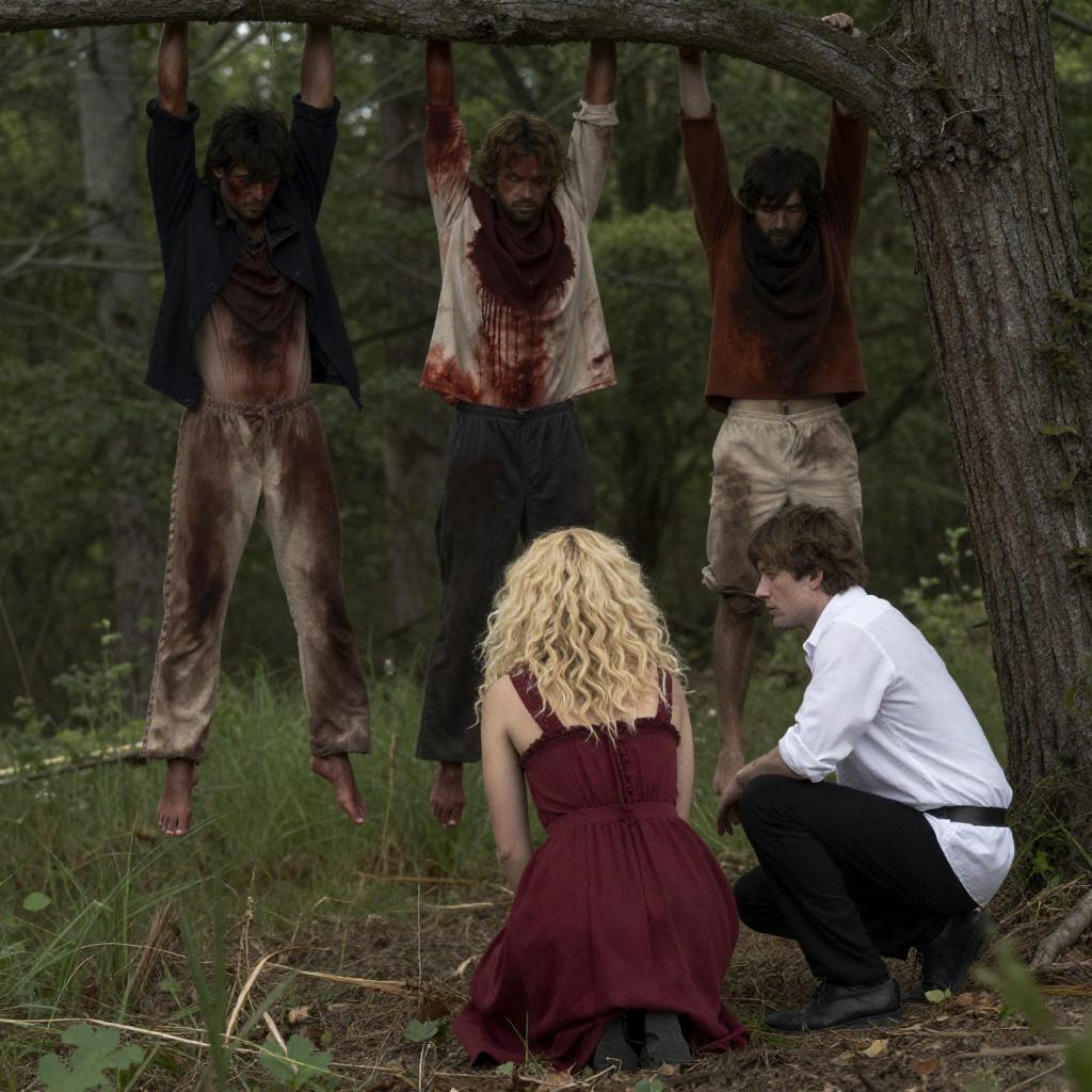 Photograph of a forest scene with three men in tattered, blood-stained clothing hanging from a tree, and a woman with curly blonde hair and a red dress kneeling on the ground. A man in white and black crouches beside her. Dense trees and grass fill the background.