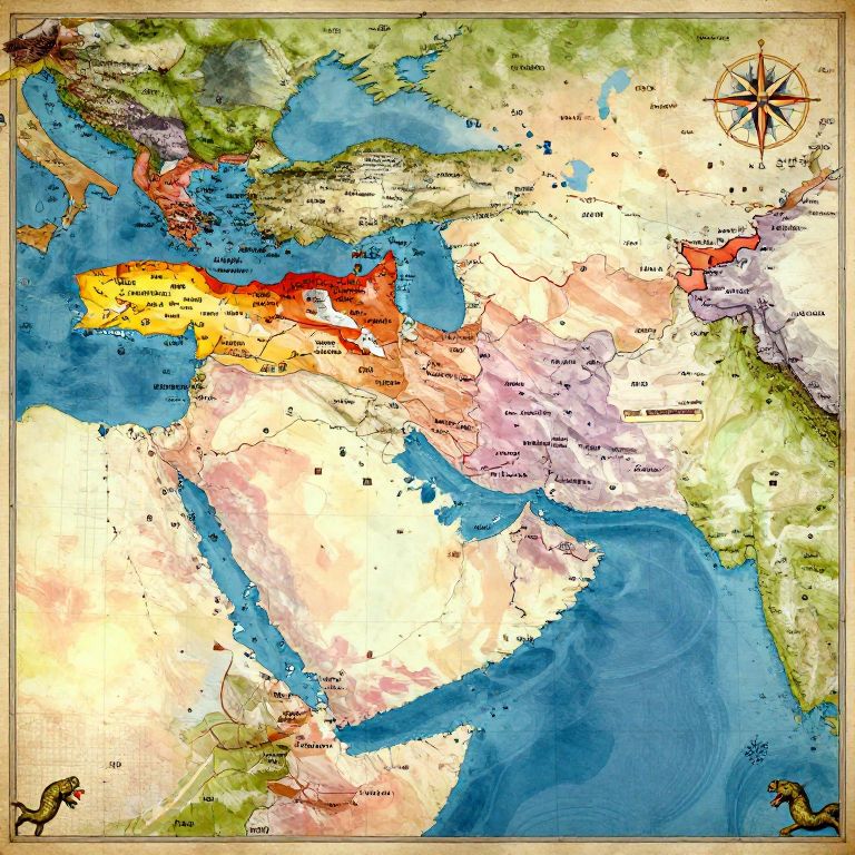 Alexander the Great conquest map showing vast territories from Greece to India, vibrant colors highlighting different regions conquered, intricate details of battle sites and legendary routes, old-world style with compass roses and sea monsters on edges