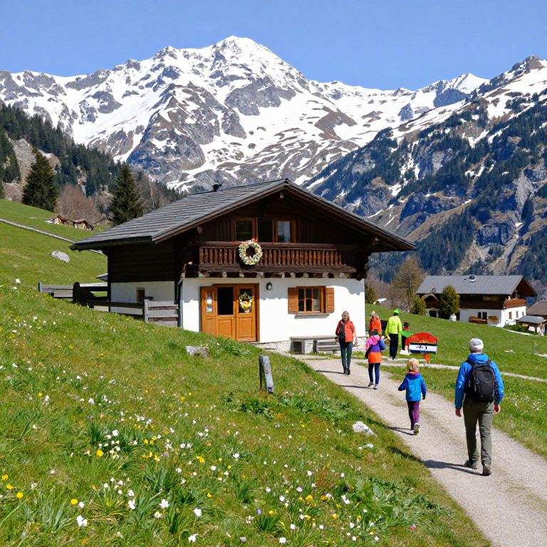 Osterurlaub mountain retreat during early spring with snow melting on peaks, wildflowers beginning to bloom, a cozy chalet with Easter wreaths on the door, families hiking on trails, bright and crisp atmosphere capturing the joy of holiday outdoors.