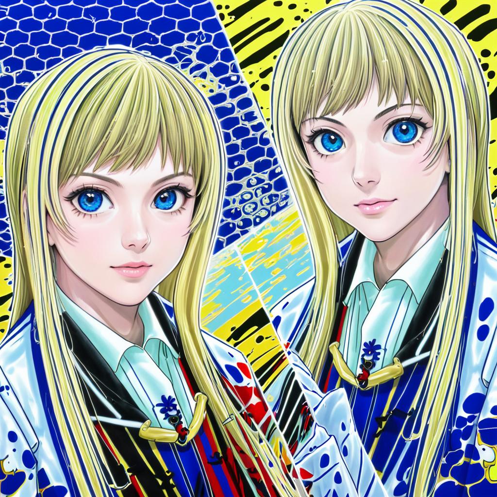 Digital anime-style illustration of a single blonde girl with long hair and bright blue eyes, depicted twice in a colorful split-screen effect. She wears a white collared shirt, black vest, and a patterned blue and white jacket with vivid multicolor accents. The background features abstract patterns in yellow, blue, and black, enhancing the vibrant and dynamic composition.