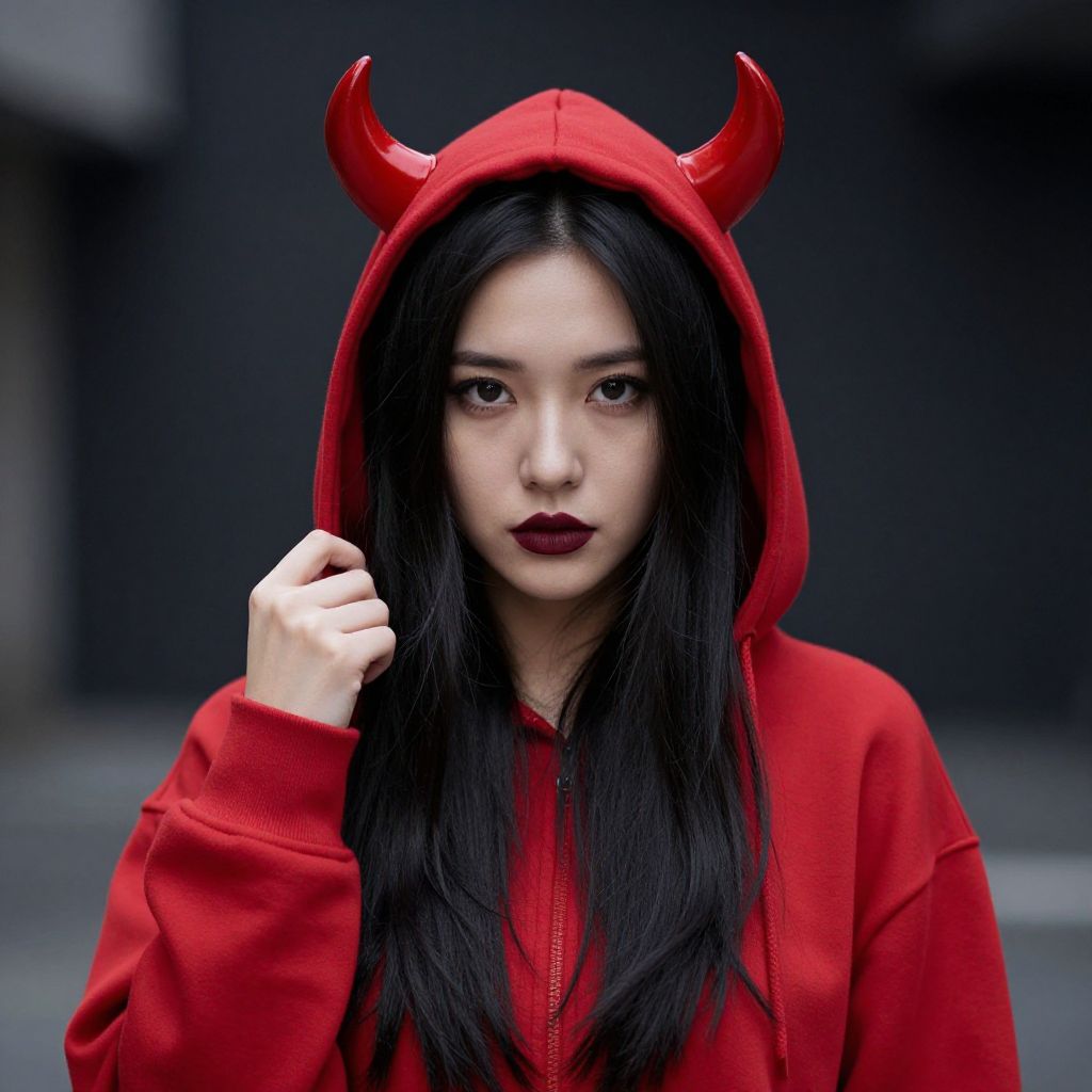 Photograph of an Asian woman with long black hair, wearing a red hoodie with devil horns, dark red lipstick, and a neutral expression, against a