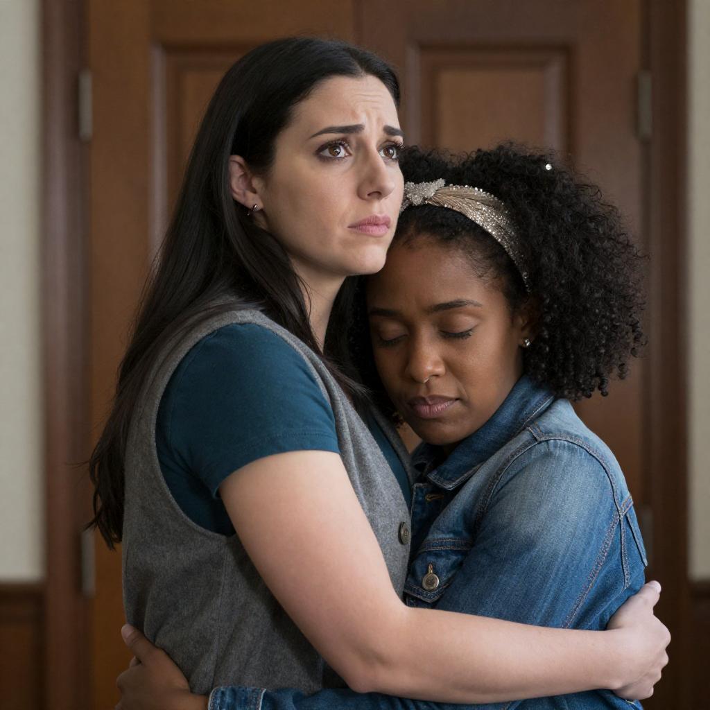 Photograph of a white woman with black hair, wearing a gray and blue sweater, holding a black woman with curly hair, wearing a blue denim jacket and a black headband, who is resting her head on the white woman's shoulder, eyes closed. The background is blurred with dark wooden panels. The white woman looks upward with a concerned expression.