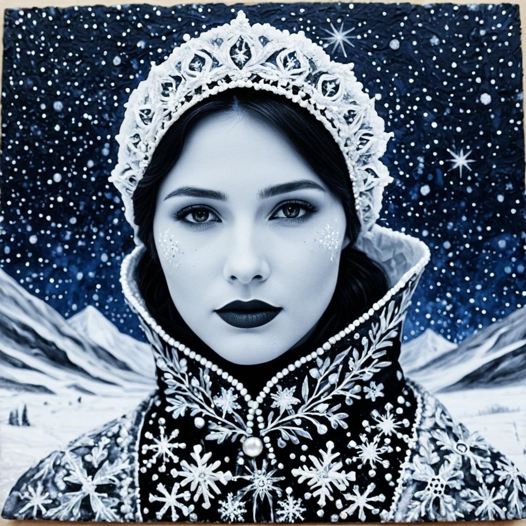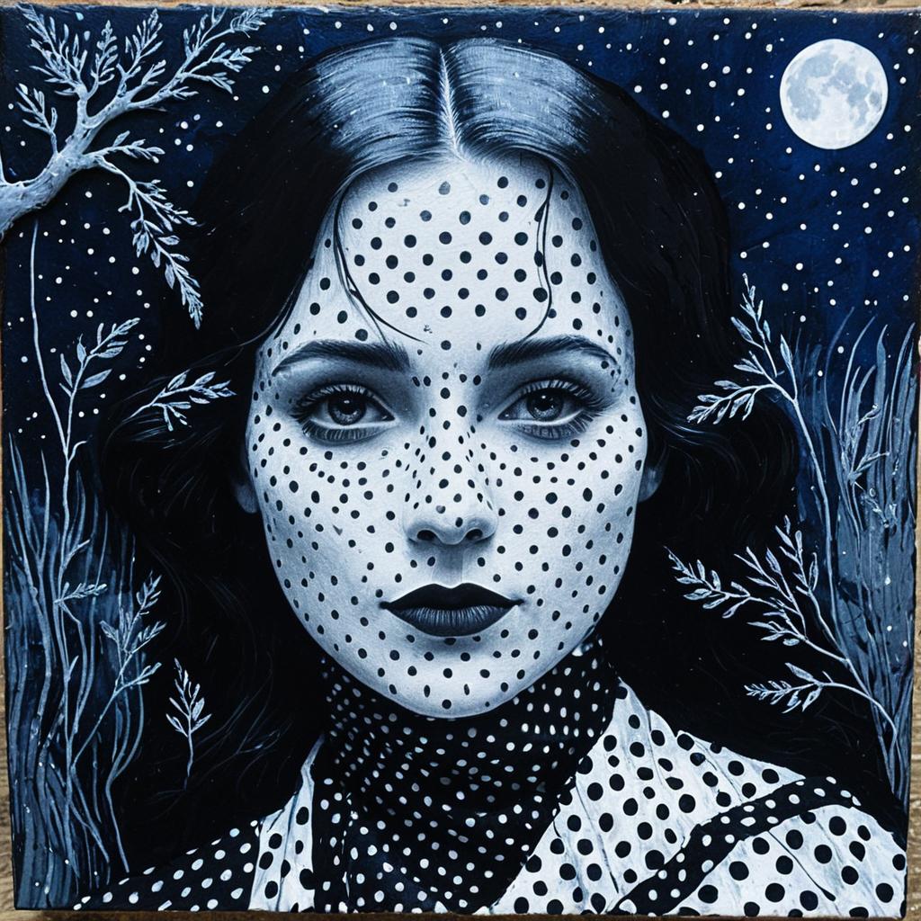 Photonegative refractograph polkadot haute couture, ghostly maiden of the moonlit creek, tranquil midnight, encaustic painting, decoupage, facial closeup