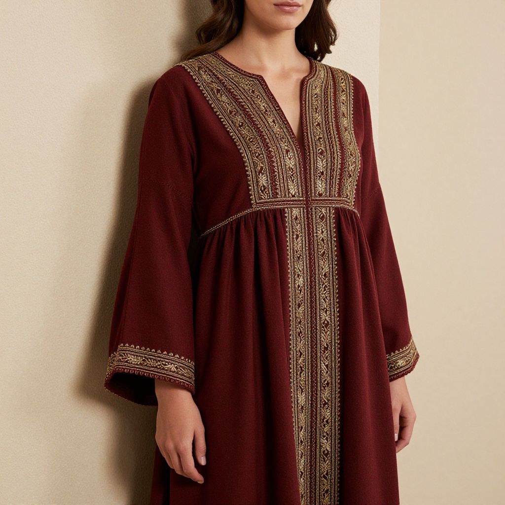 Ancient cretan dress, a close up of a woman in a dress standing near a wall