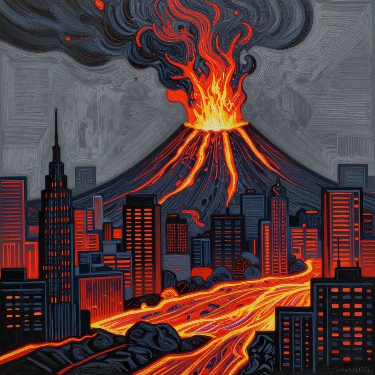 This digital illustration, in a vibrant, comic-style art, depicts a volcanic eruption engulfing a cityscape. A large, dark volcanic mountain with intense red-orange lava flows erupts at the top, spewing fiery plumes into a gray, smoky sky. The lava cascades down the mountain, spreading through the city streets, illuminating black buildings with bright, glowing lines. The city's skyscrapers are varied in height and design, with windows and architectural details rendered in sharp, contrasting black and red-orange hues. The scene is dynamic, with swirling smoke and flowing lava creating a sense of chaos and urgency.