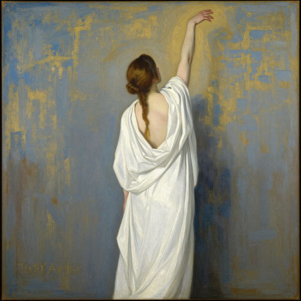 Oil painting of a woman in a loose white toga, arm raised, facing a blue and gold textured wall, signature "Tutti Arti