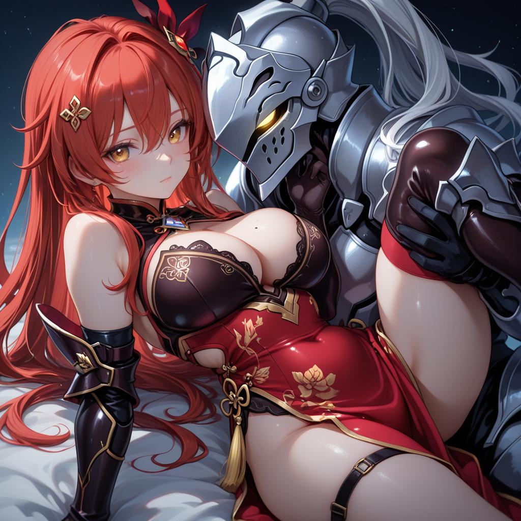 Digital artwork featuring Murata Himeko from the Honkai series. The female character has long red hair with hair ornaments, yellow eyes, and a mole on her breast. She wears a revealing red China dress with floral patterns, lace details, and black gloves. She is accompanied by a silver armored knight with glowing yellow eyes. The background is a starry night sky.