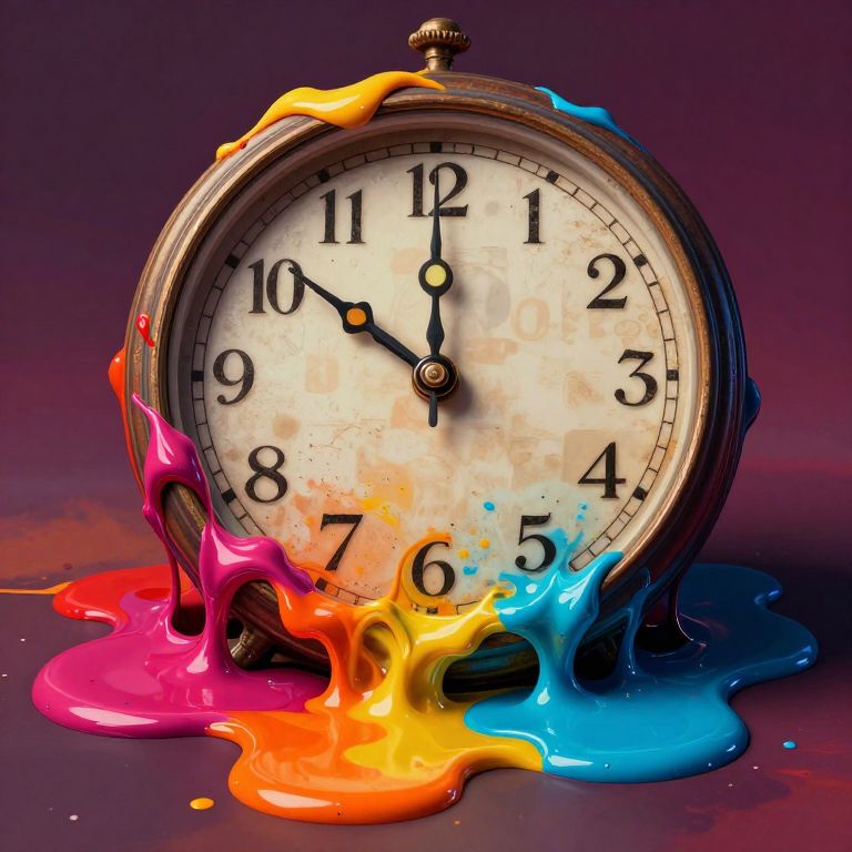 A surreal, highly detailed 3D artwork featuring a classic clock melting into a vibrant pool of paint, The clock face is half-submerged, with the liquid paint seamlessly blending into its structure, creating an illusion of time dissolving, The hands of the clock are twisted and drooping, as if succumbing to the fluidity, The color palette is bold and striking, with rich, saturated hues in the paint contrasted against the antique, weathered clock, The lighting is dramatic, casting deep shadows that enhance the melting effect, evoking a sense of time's ephemeral nature