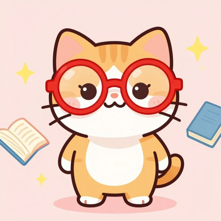 Cute, chibi-style, orange-and-white cat with large red glasses, standing, blushing, with two floating books and sparkles on a