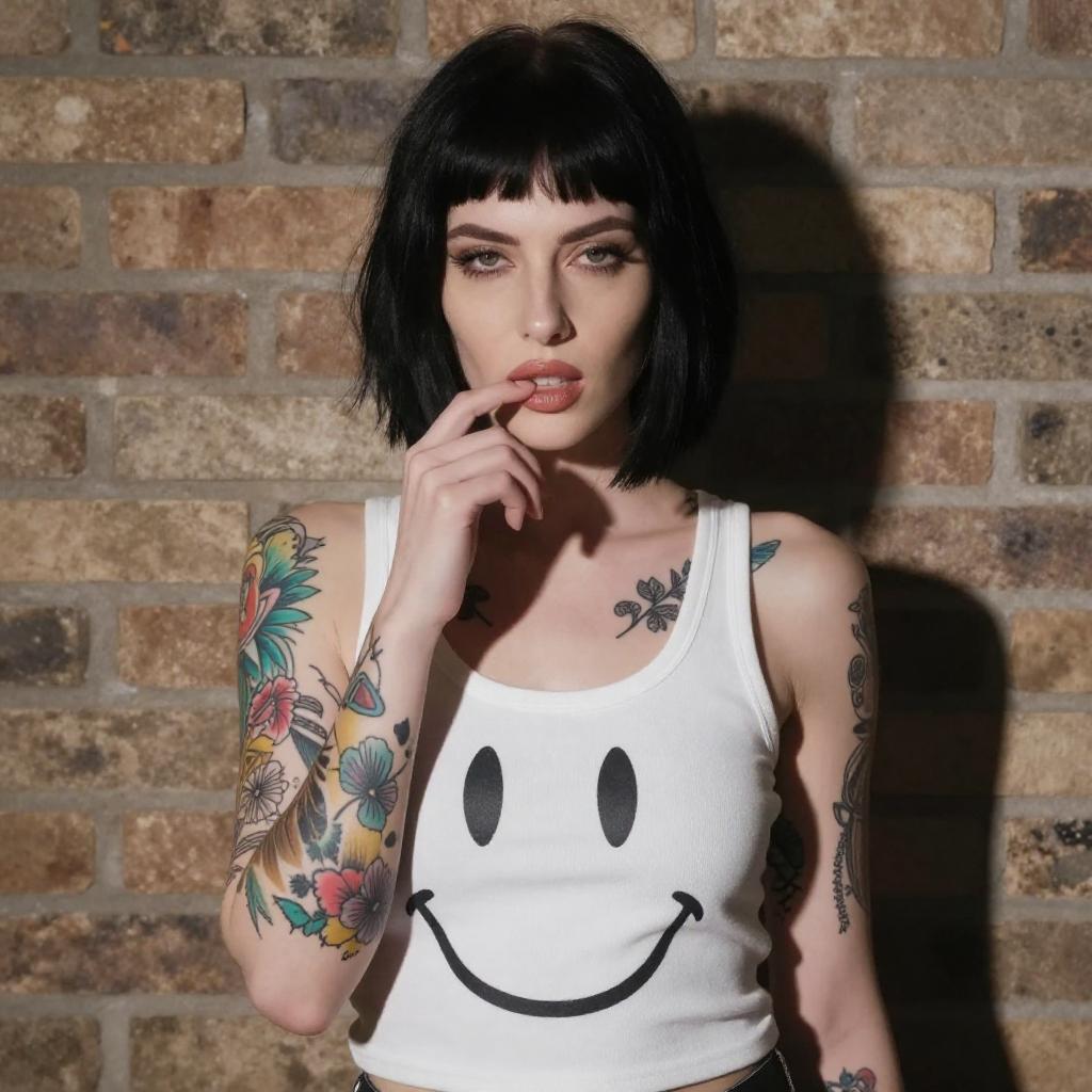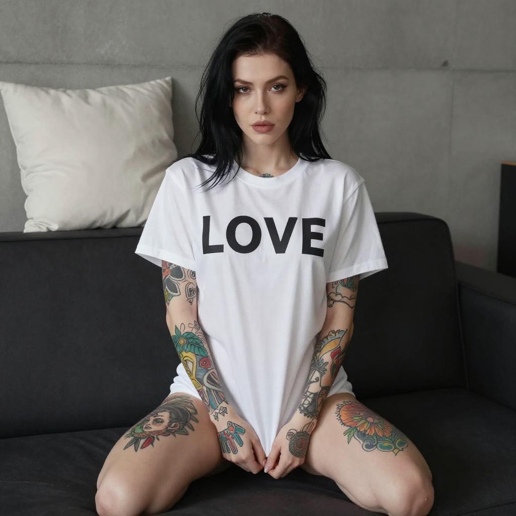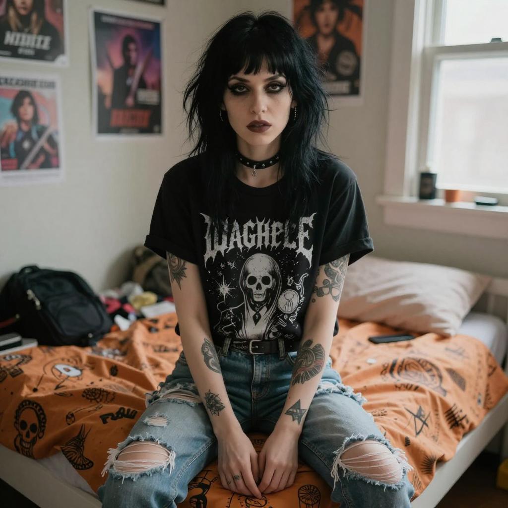 Photograph of a pale-skinned woman with black hair and bangs, wearing a black graphic t-shirt, black choker, and ripped jeans. She has multiple tattoos on her arms and sits on an orange-patterned bed in a cluttered room with posters on the wall and sunlight streaming through a window.