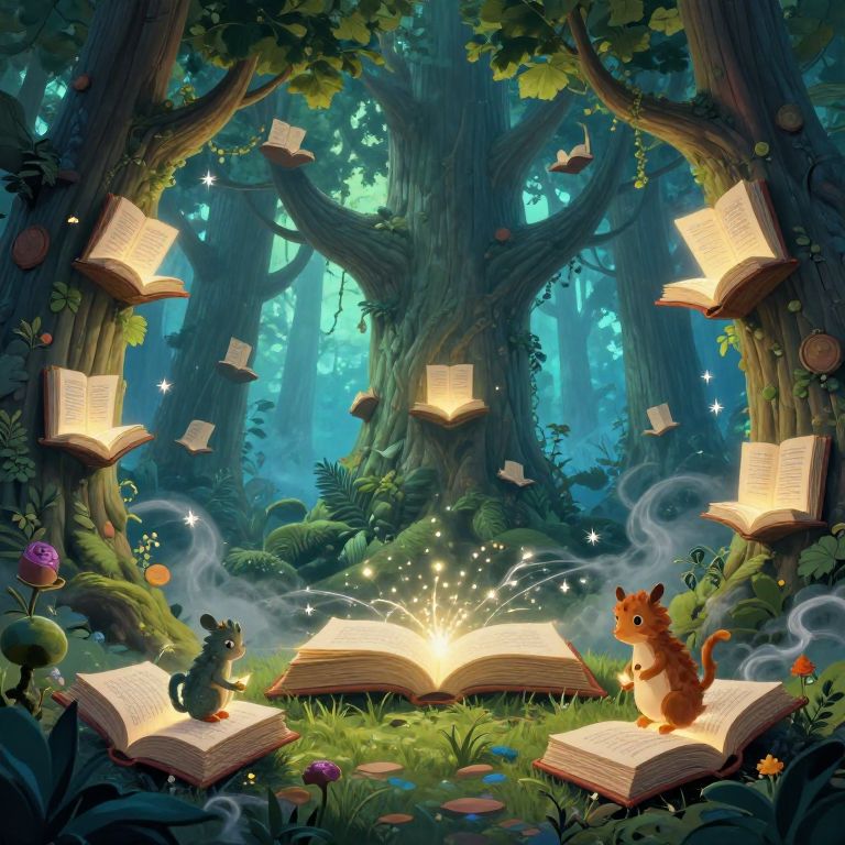Book art images illustrating an enchanted forest scene where giant books grow like trees with glowing pages, mythical creatures browsing through them, magical sparkles and mist swirling around, vibrant greens and blues, fantasy art with rich detail and depth