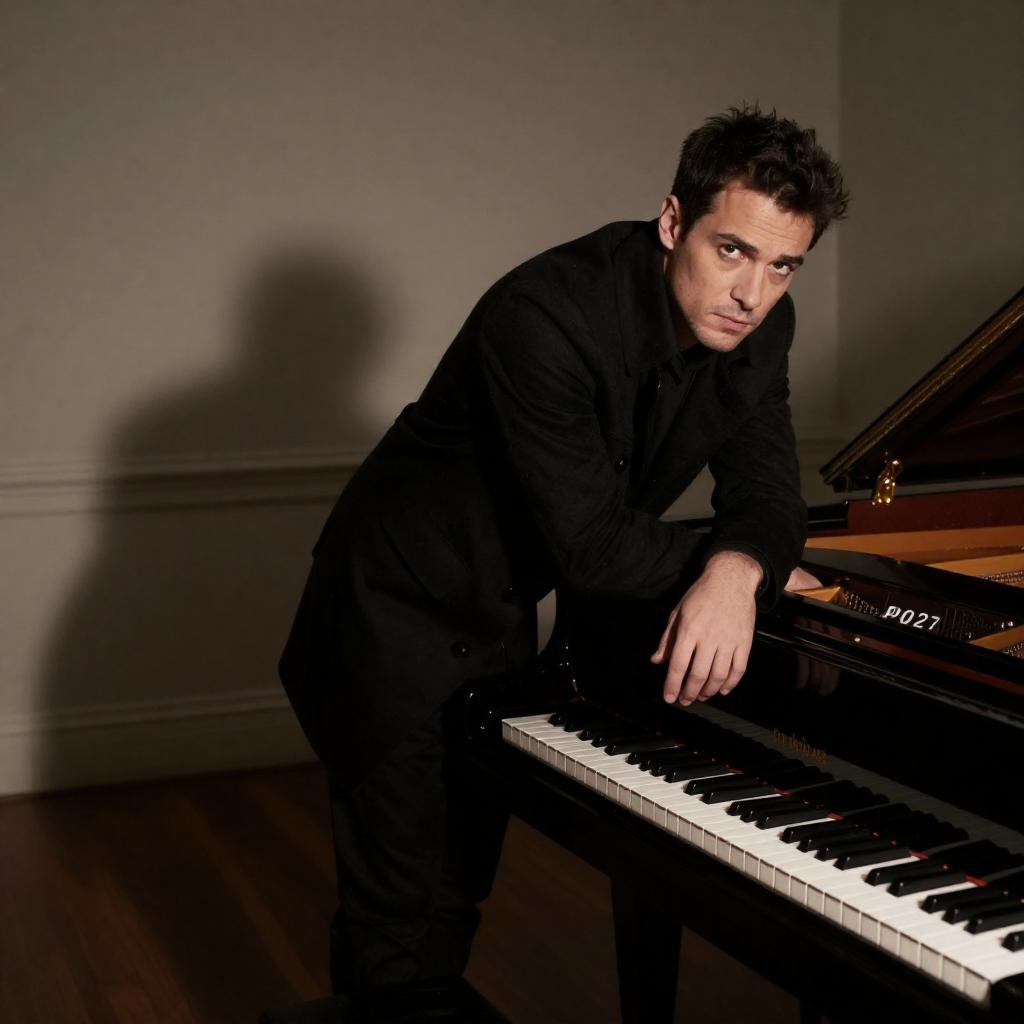 Two men on stage, one standing with microphone, gray sweater, and scarf, singing, the other seated at grand piano, playing, wearing green jacket. Christmas tree with lights in background, framed photos on wall, microphone on piano stand.