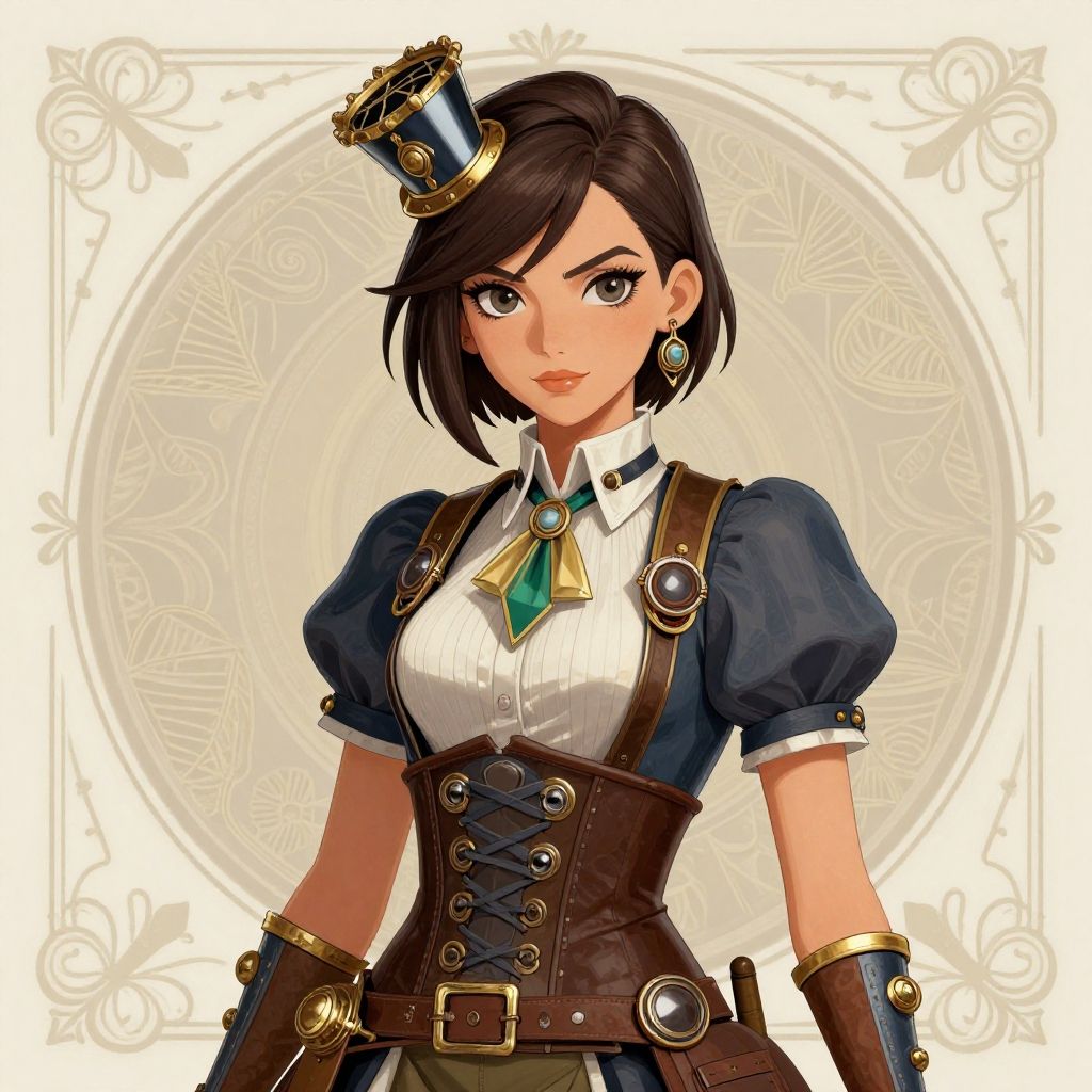 This captivating illustration features a young woman with striking features, dressed in a unique, steampunk-inspired outfit. Her confident expression combined with the detailed background creates a visually appealing contrast, highlighting the intricacies of her attire and the vibrant colors that define the artwork's style.