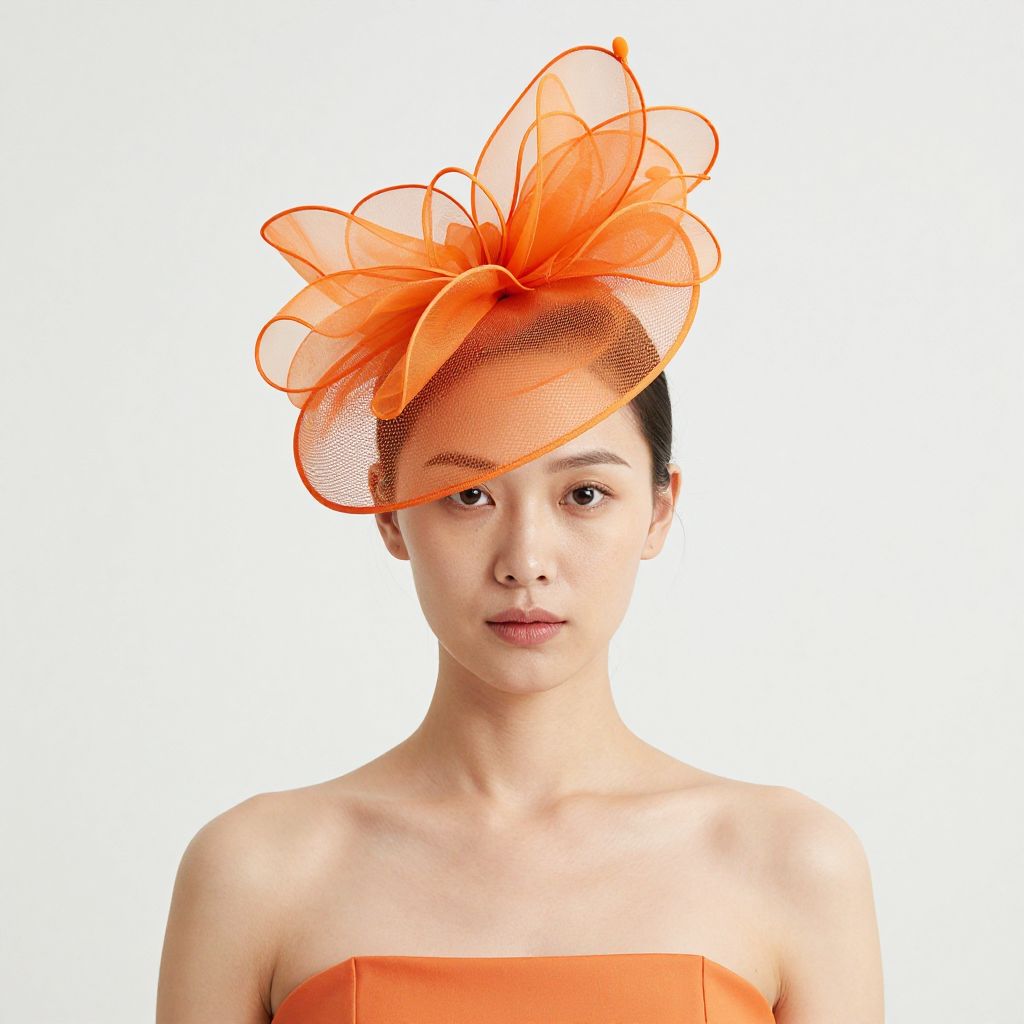 Photograph of an East Asian woman with fair skin, wearing an orange strapless dress and an elaborate orange fascinator hat. The fascinator features large, semi-transparent, petal-like layers with a mesh overlay, creating a vibrant and striking contrast against her dark hair. The woman has a neutral expression, with light makeup and subtle pink lipstick. The background is completely white, making the orange attire and hat the focal points. The image has a clean, studio-quality appearance, emphasizing the fashion elements.