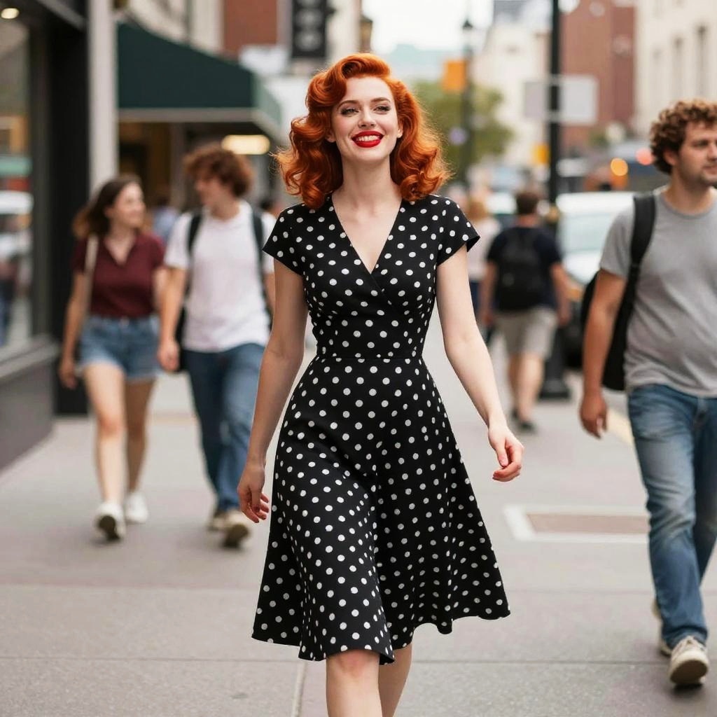 Photograph of a fair-skinned, red-haired woman with wavy hair standing in a cozy café. She wears a black and white striped sleeveless top and a high-waisted, knee-length black skirt, paired with red high-heeled shoes. Her arms are raised, hands resting on her head. She has red lipstick and a confident expression. The café has beige walls, wooden chairs with white polka dot upholstery, and round tables with small potted plants. Overhead lights illuminate the space. The floor is tiled in a light gray pattern. The background shows a counter with a cash register and additional seating.