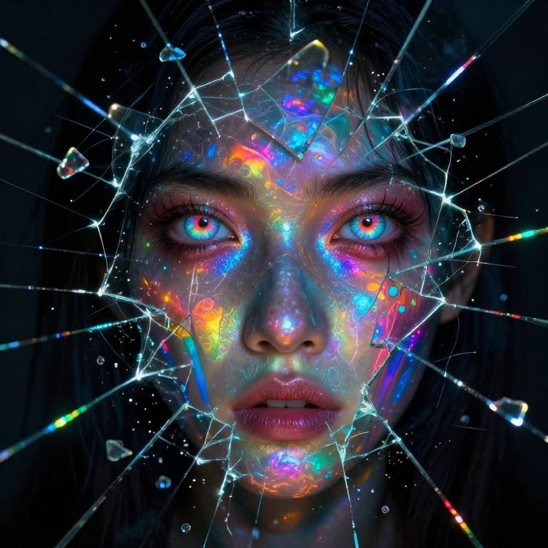 Digital artwork of a woman with glowing, multicolored eyes, shattered glass around her face, and vibrant rainbow reflections on her skin, creating a surreal