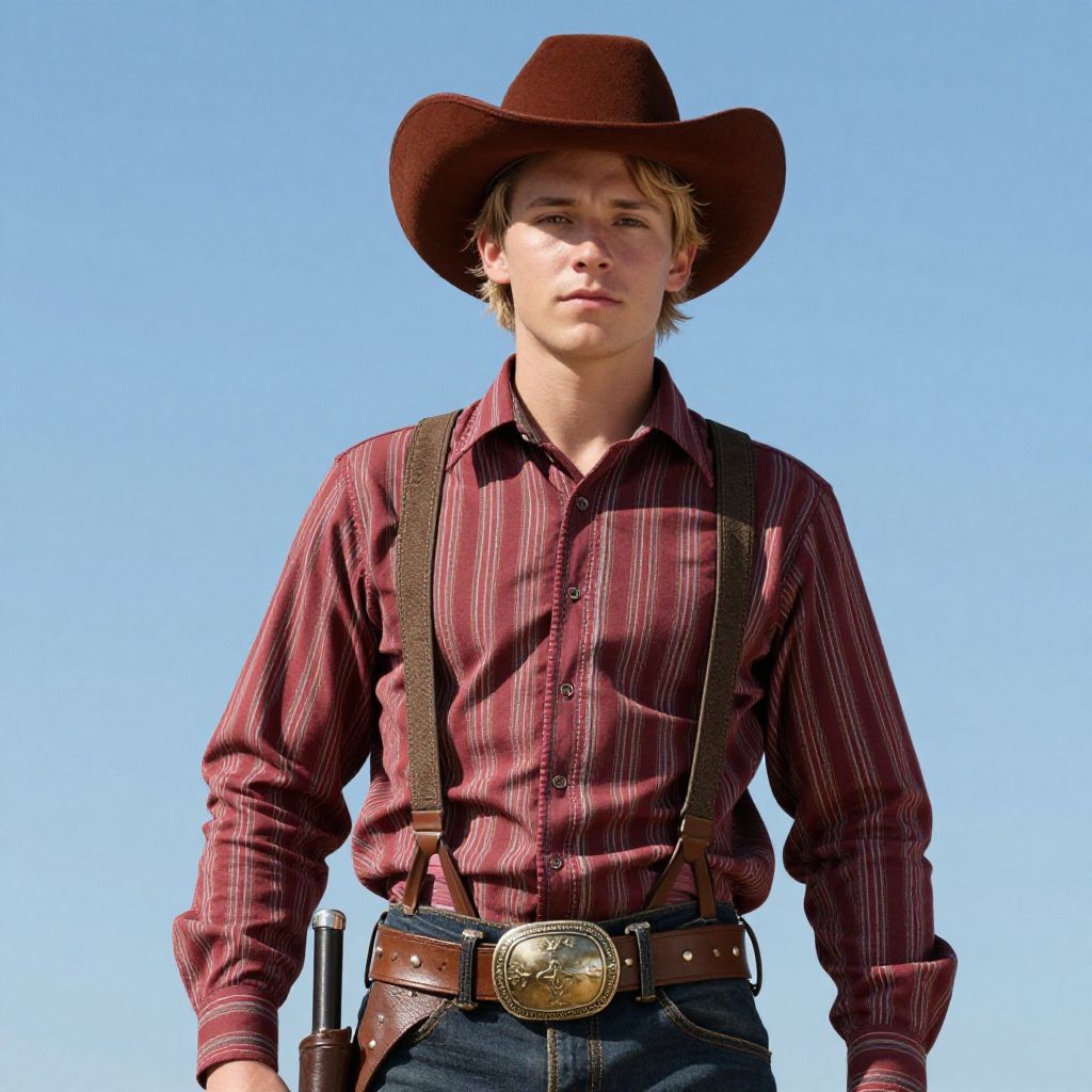 Photograph of a young, blonde Caucasian man in a brown cowboy hat, red striped shirt, and brown suspenders, with a large belt buckle,