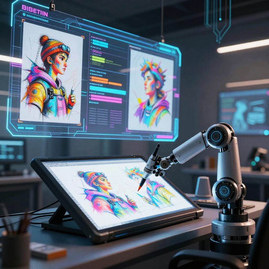 AI draw pictures in a futuristic digital art studio, neon-colored holographic screens displaying vibrant sketches, sleek robotic arms painting on virtual canvases, a blend of technology and creativity with glowing circuits, ultra-realistic style, high detail