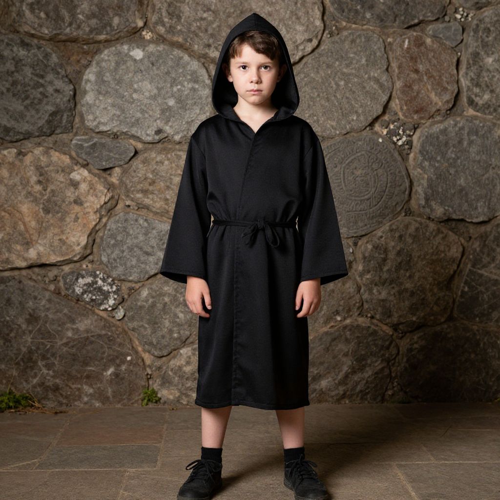 Photograph of a young boy with fair skin and brown hair, wearing a black hooded robe, standing against a textured stone wall.