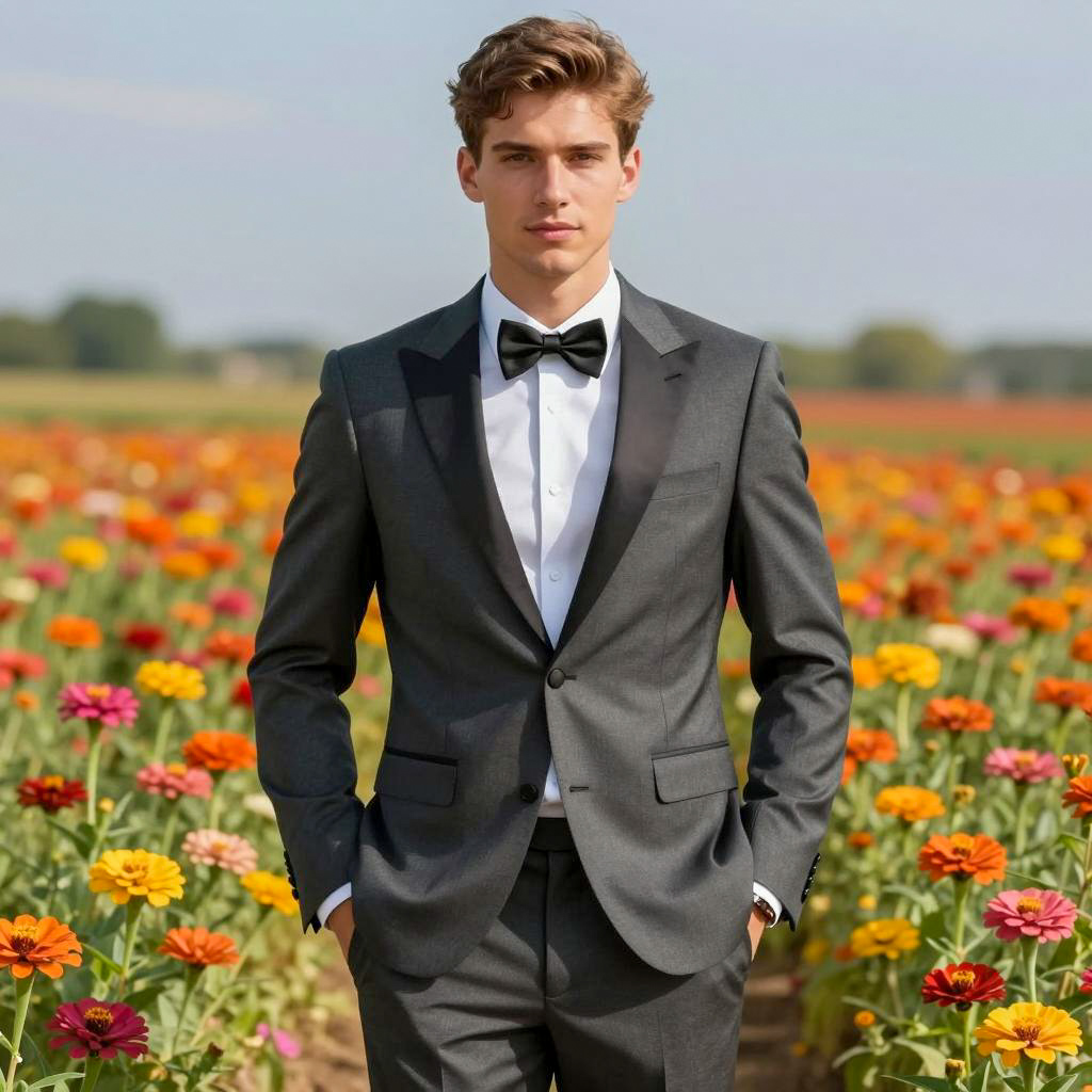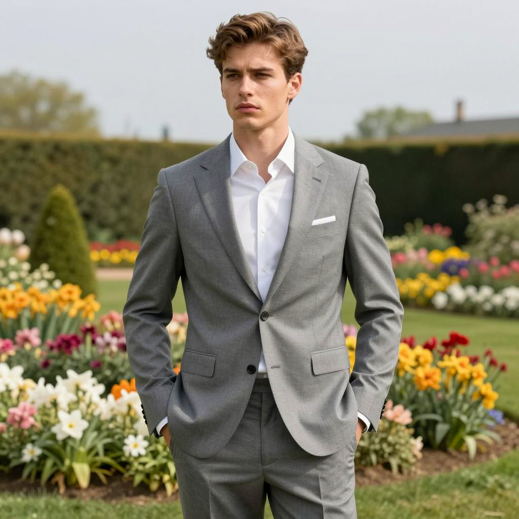 Fancy clothes male, photorealistic portrait of a handsome young man with fair skin, short brown hair styled neatly, wearing a brown suit, white shirt, and colorful bow tie, standing in a bright garden with pink flowers in the background, sunlight, daytime, serious expression, shallow depth of field, vivid colors, high detail, modern fashion style, professional photography, realistic ure and lighting