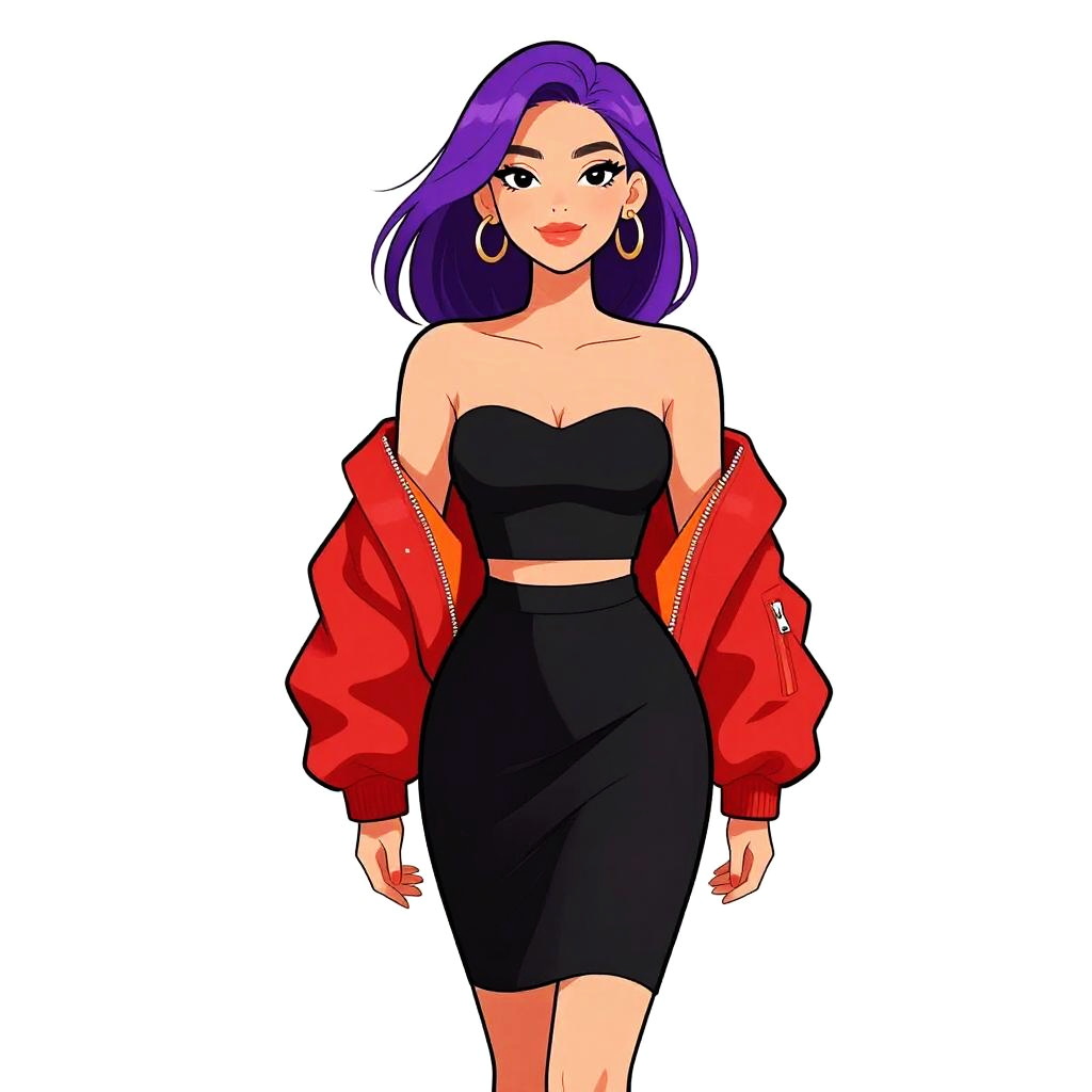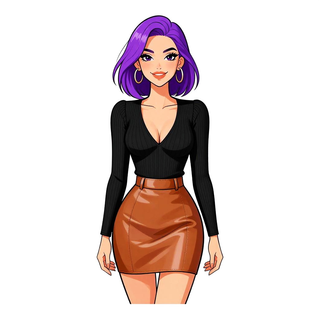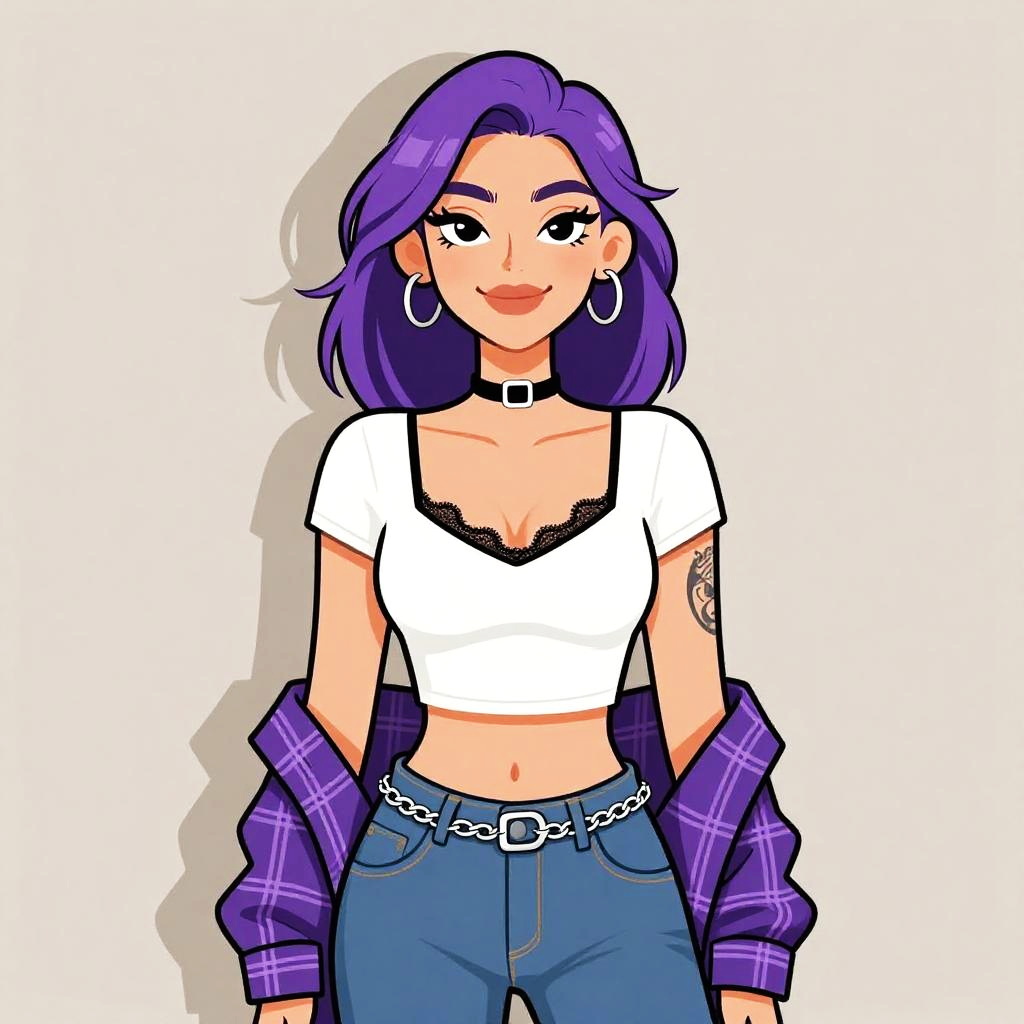 Digital illustration of a confident woman with purple hair, wearing a black sleeveless crop top, high-waisted mini skirt, and large hoop earrings,