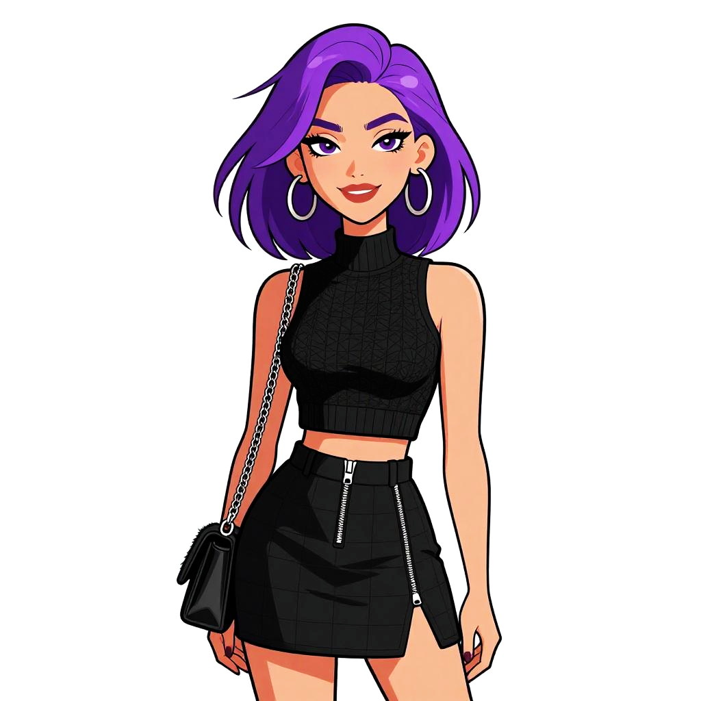 This digital illustration features a confident woman with vibrant purple hair styled in a sleek bob. She has fair skin, striking purple eyes, and wears bold red lipstick. She is dressed in a black, sleeveless, turtleneck crop top and a high-waisted, black mini skirt with a zipper on the side. She accessorizes with large silver hoop earrings and carries a small black shoulder bag with a chain strap. The background is plain white, emphasizing her stylish, modern outfit. The illustration uses a bold, colorful, and slightly cartoonish art style, with thick black outlines and vivid colors.