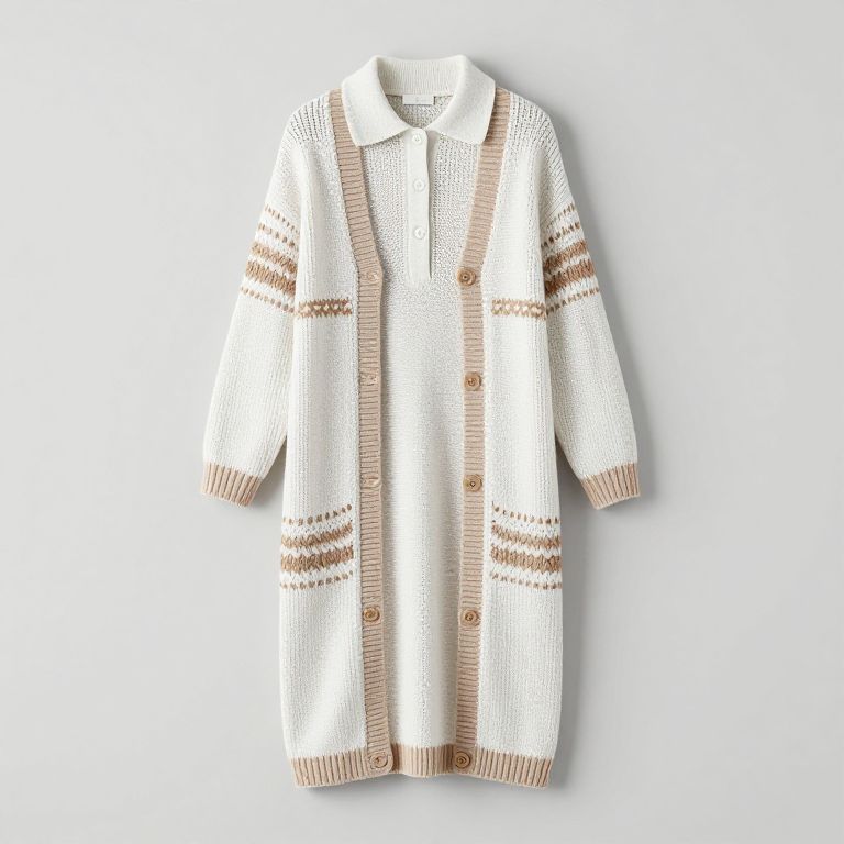 A long knitted dress with a shirt collar style, featuring a cardigan with intarsia patterns in white and beige colors, reaching to the ankles.