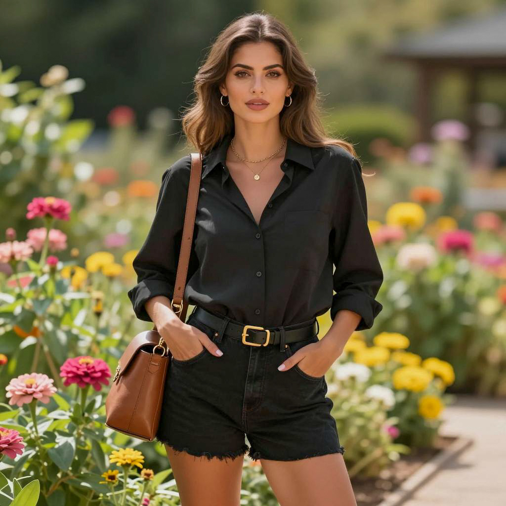 Blonde woman with long hair, wearing black long-sleeve top, high-waisted dark denim shorts, brown mini crossbody bag with gold chain strap, black boots, leaning against gray concrete wall. She raises her right hand to her forehead, looking to the side. White card in left hand. Concrete wall in background. Daylight.