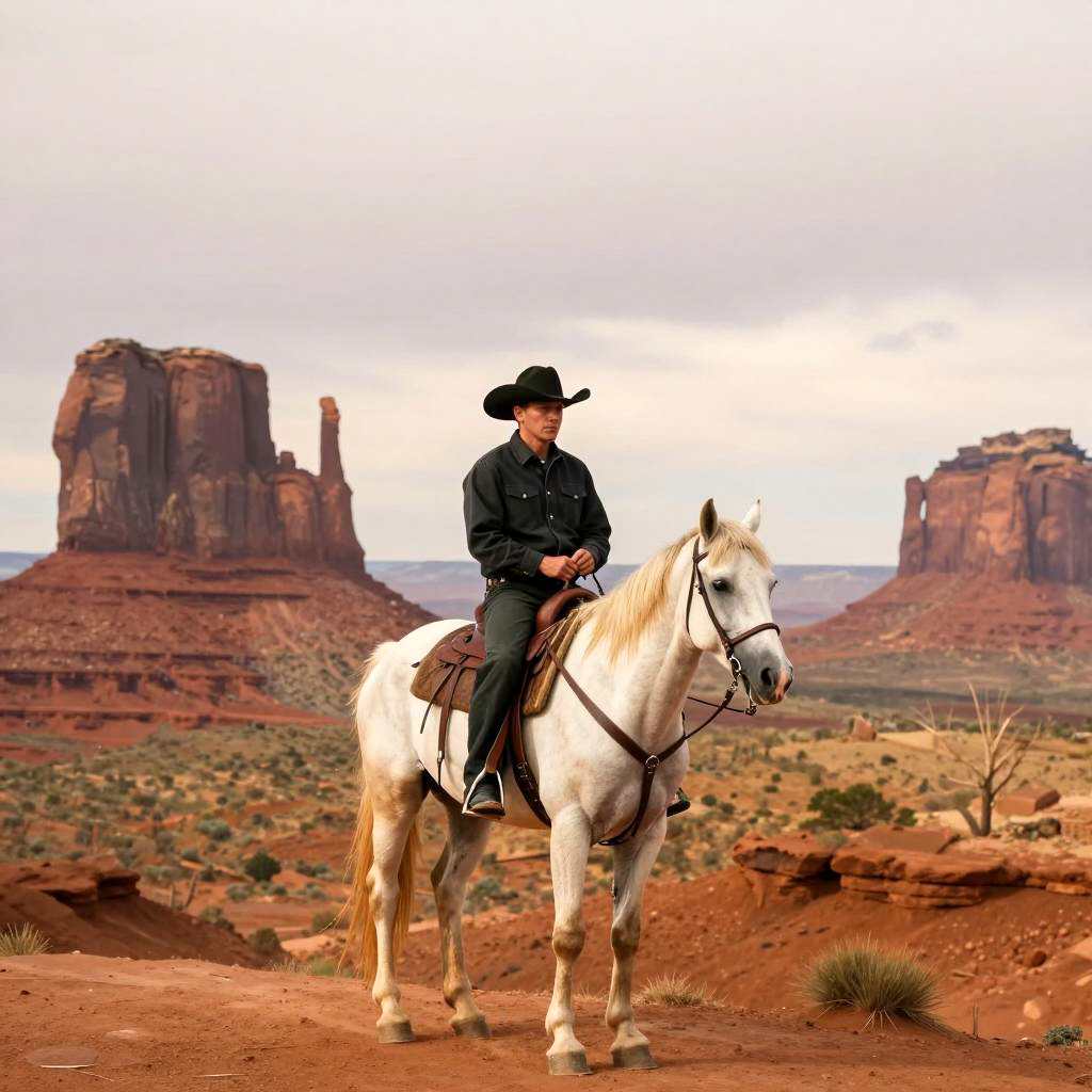 Silhouetted photograph of two people riding horses in a hazy yellow desert. Both wear hats, riding towards the viewer. Dust clouds beneath horses. Foreground horses' hooves slightly raised. Slight wind in horses' manes. Clear horizon line in background.