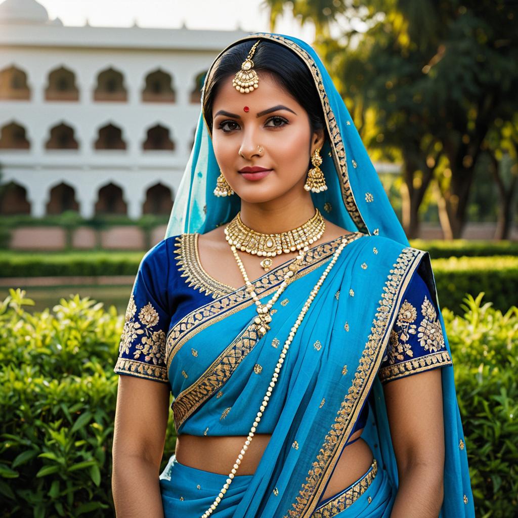 Blue raya costume, photorealistic, woman in traditional Indian attire, blue and gold embroidered saree, matching headscarf, jewelry, intricate facial makeup, medium skin tone, standing outdoors, background with blurred building and greenery, sunny, confident expression, detailed ures, realistic lighting, T2I model, elegant and regal style, centered composition