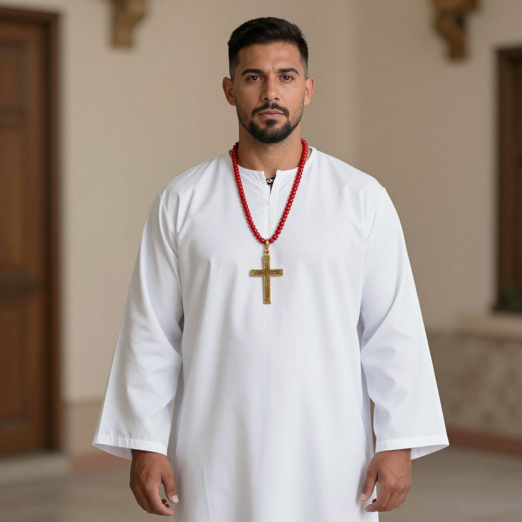 Traditional Attire Man Costume, man in a white robe and red necklace with a cross