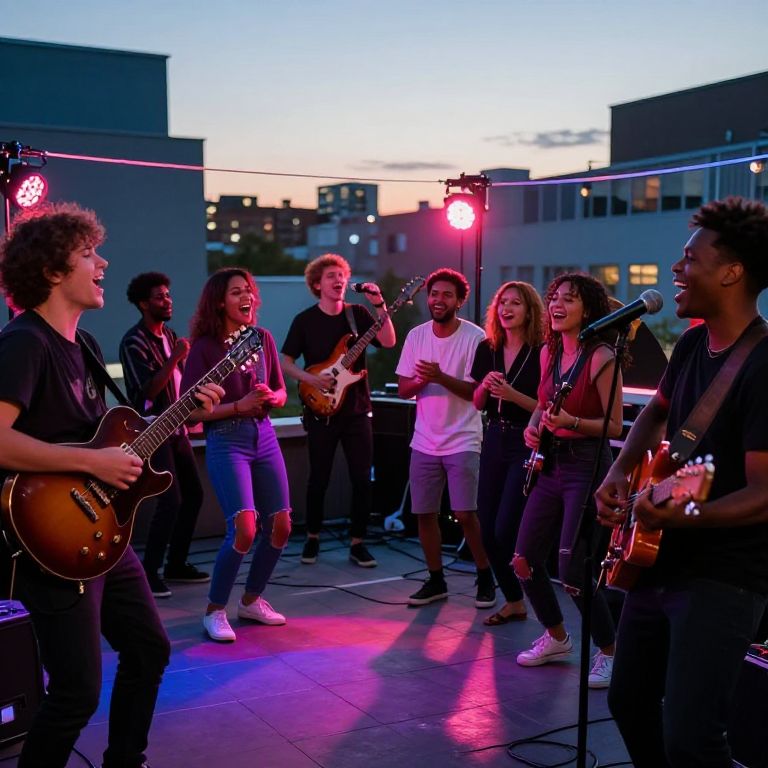 Photograph of a diverse group of young musicians performing on a rooftop at sunset, illuminated by colorful stage lights, playing guitars and singing passionately. Urban buildings