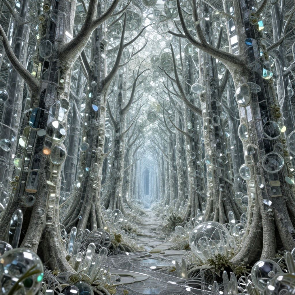 This is a digital artwork depicting a surreal, ethereal forest path. Tall, slender trees with gnarled roots and delicate branches form a tunnel, their bark and branches adorned with numerous hanging glass spheres in various sizes and colors, reflecting light. The forest floor is covered in a soft, white, moss-like substance. The background fades into a bright, misty blue, creating a sense of depth and mystery. The overall color palette is cool with shades of blue, gray, and white, enhancing the otherworldly atmosphere. The image has a highly detailed, almost hyper-realistic style, with a focus on textures and reflections.