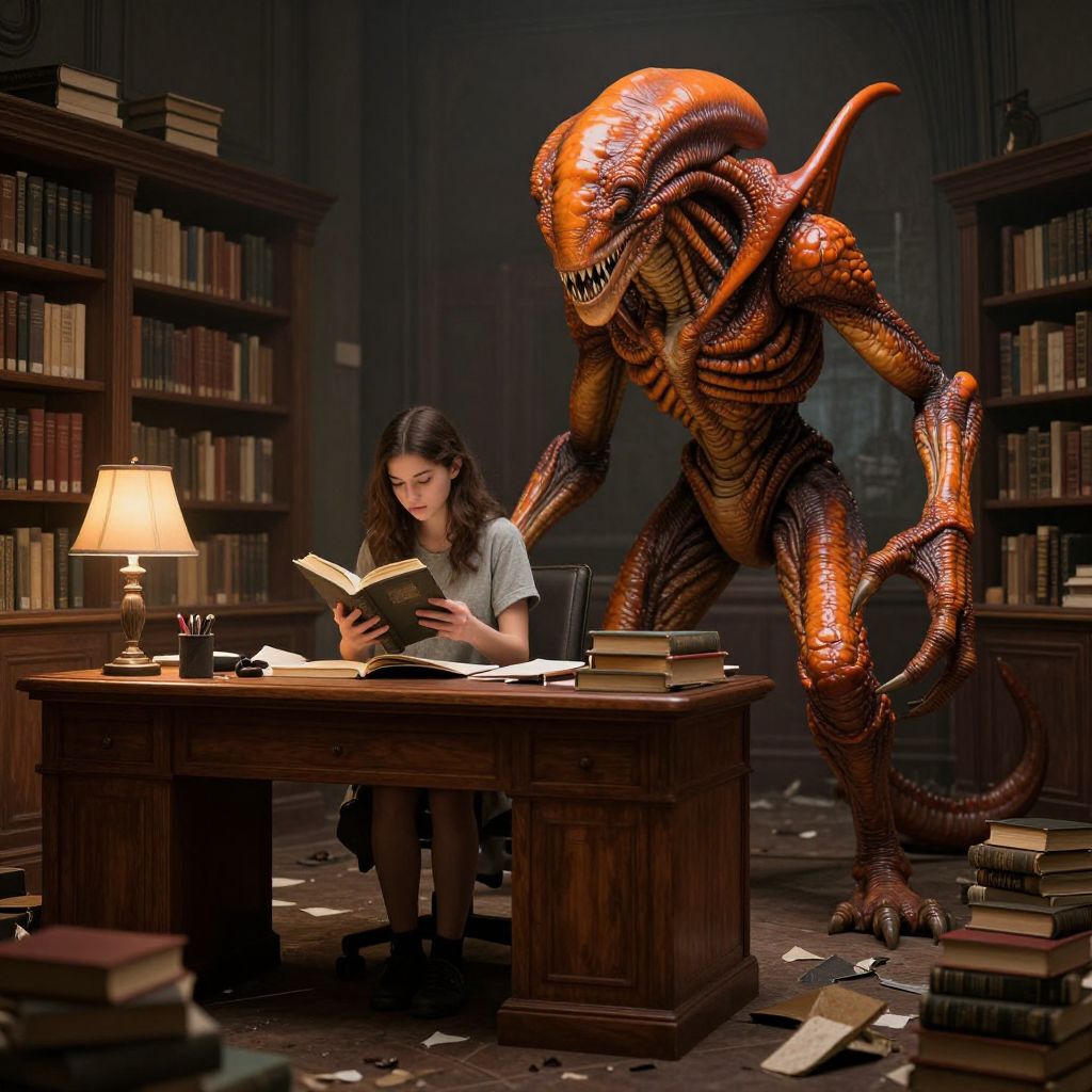 In a dimly lit library, a young woman stands by a wooden desk, engrossed in reading a book, while a towering alien creature with a scaly orange body and sharp teeth looms nearby, surrounded by scattered books and debris on the floor.
