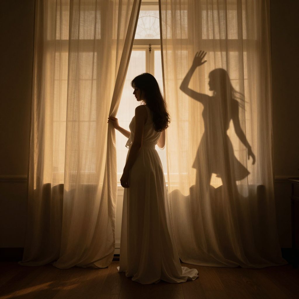 Silhouetted woman in flowing dress standing by window, pulling curtains, with shadow of dancing figure on sheer curtains. Photograph, warm light.