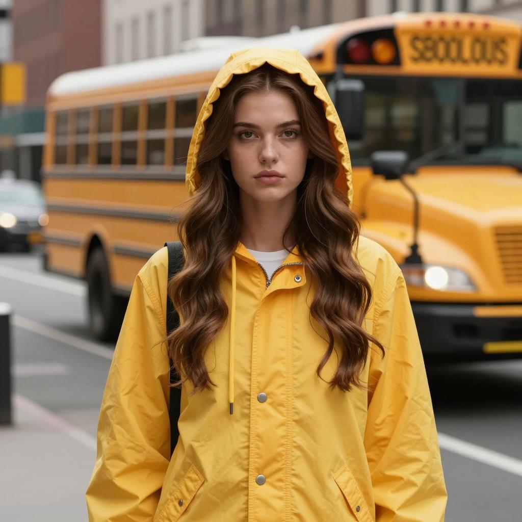Photorealistic image of a young woman with long wavy brown hair wearing a yellow hooded jacket. She stands on an urban street with yellow school buses in the blurred background. The woman has a serious expression, neutral makeup, and casual fashion style. The photo features realistic lighting and skin tones on an overcast day in a city environment.
