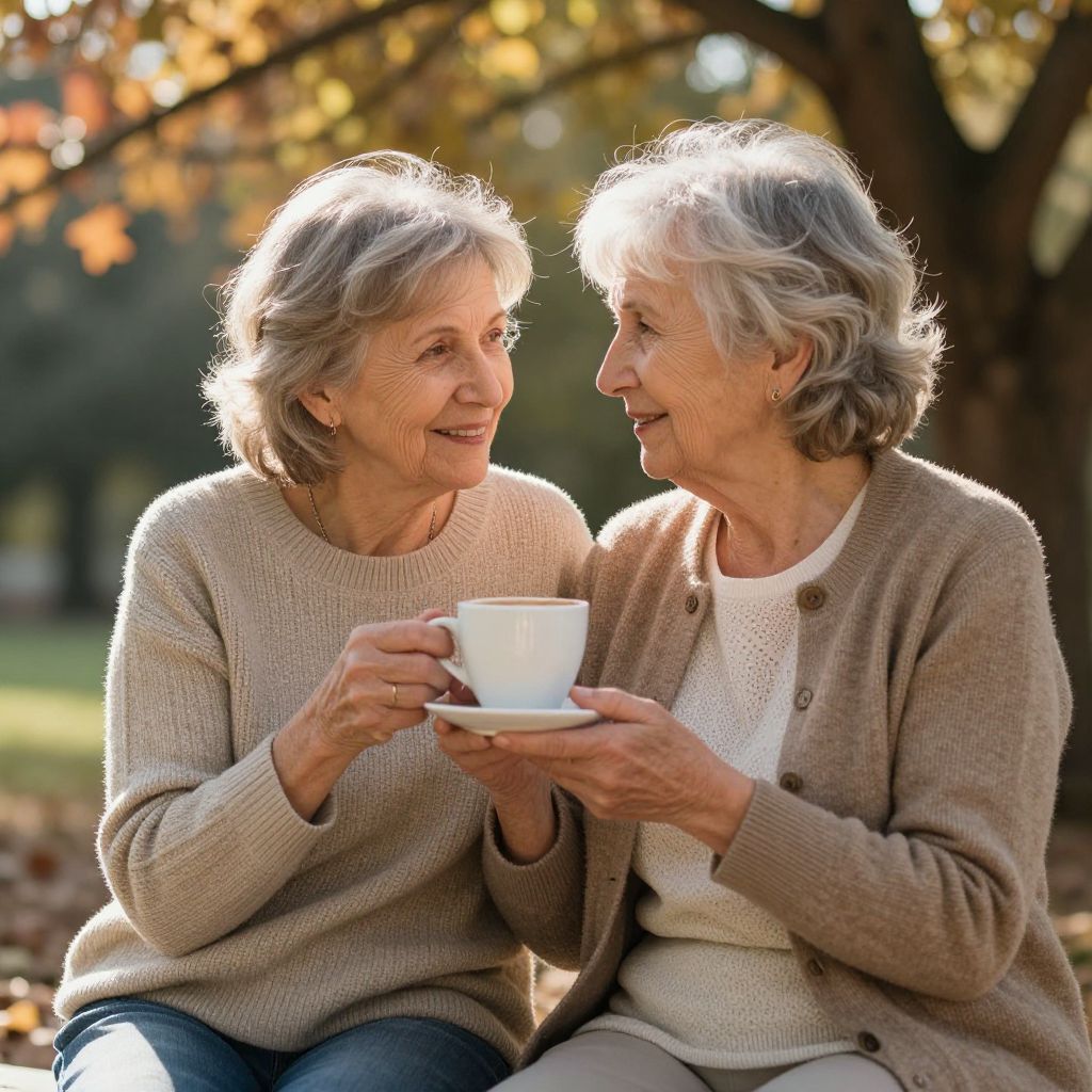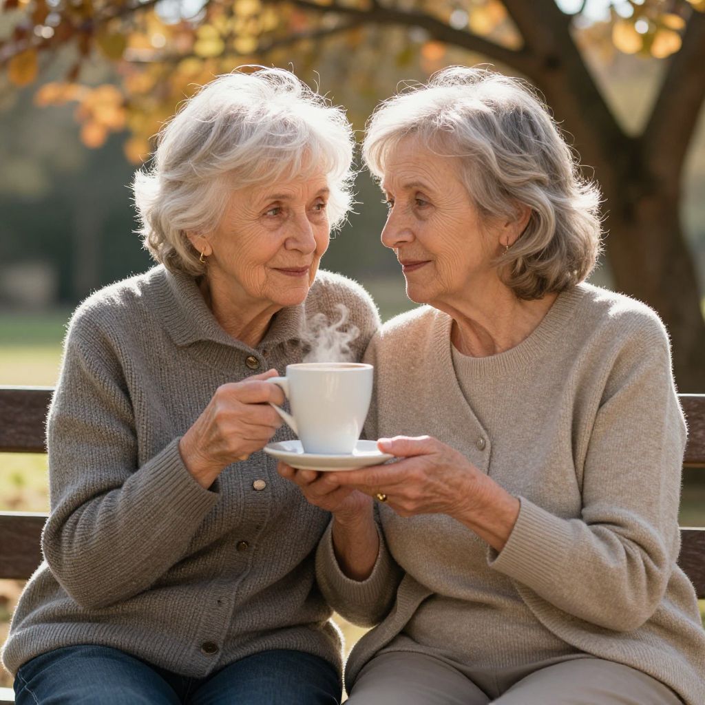 Photograph of two elderly women with short, gray hair, sitting on a wooden bench in a sunlit park during autumn. Both women are wearing beige knit sweaters; the woman on the left also has a brown cardigan. They are smiling at each other while holding a white teacup and saucer. The background features blurred trees with orange and yellow leaves, and sunlight filtering through. The women have fair skin and are sitting close together, exuding warmth and companionship. Steam rises from the teacup, indicating a hot beverage.