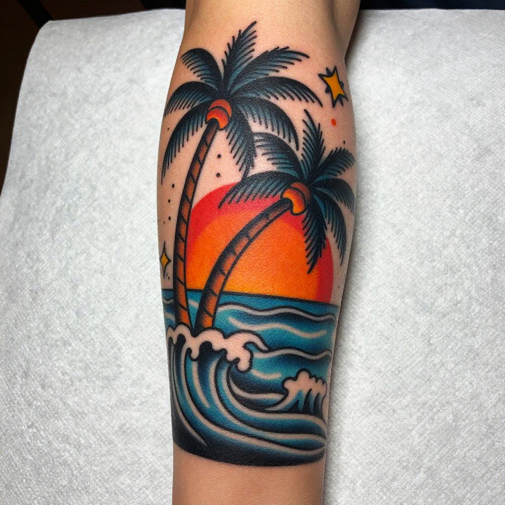 Ocean and palm tree tattoo, traditional style with rich colors and thick lines, dramatic sunset sky with orange and red hues behind bending palm trees, deep blue ocean waves, iconic tattoo elements like stars and dots, bold and eye-catching art perfect for forearm or calf.