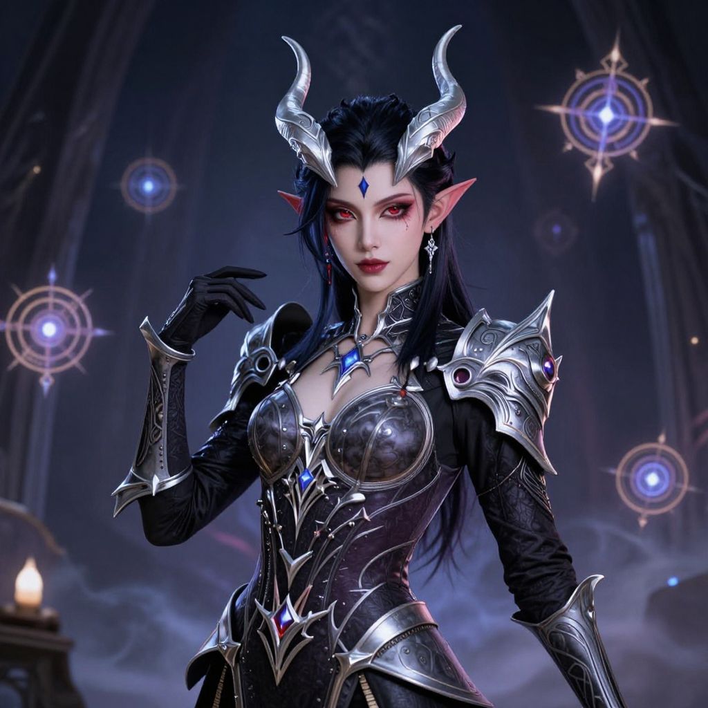 Digital artwork of a dark elf woman with black hair, red eyes, and silver horns, wearing intricate metallic armor, set against a mystical, blue-l