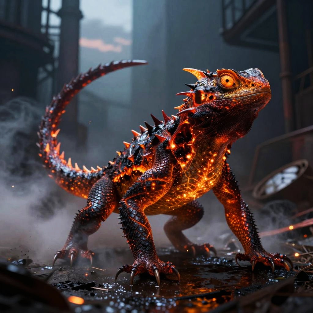 Ember-lizard creature with shimmering ember veins and charred scales, slashing its tail through the smoke-filled air, abandoned industrial district in twilight, action shot, skin pores, very dark lighting, heavy shadows, detailed face, vibrant, photorealistic, dramatic, sharp focus, 8k, (intricate:1.4), decadent, (highly detailed:1.4), digital painting, concept art, octane render, artstation, smooth illustration, global illumination, studio light, volumetric light, atmospheric fog, particles floating, embers, wet surfaces, rim light, depth of field