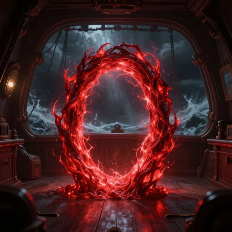 Rendering A red shimmering magical evil portal spell, inside the captains cabin of a ship storm outside, dnd, fantasy illustration, fantasy art,
