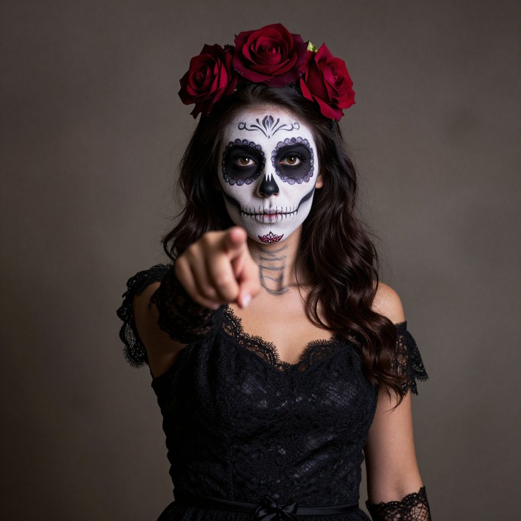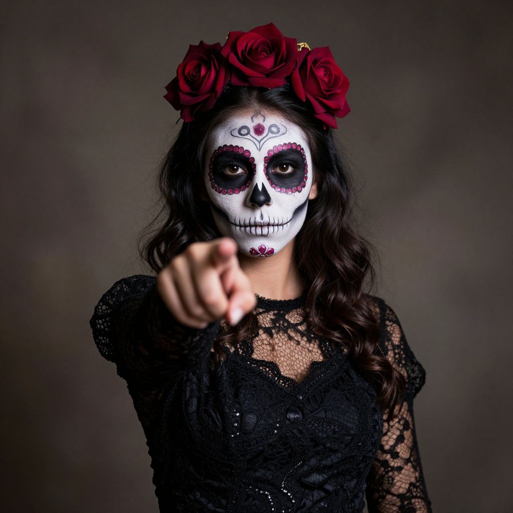 Woman wearing intricate sugar skull makeup and a dark red rose headband, dressed in a black lace dress, points directly at the camera with her right hand, exuding an eerie yet captivating presence against a muted background.