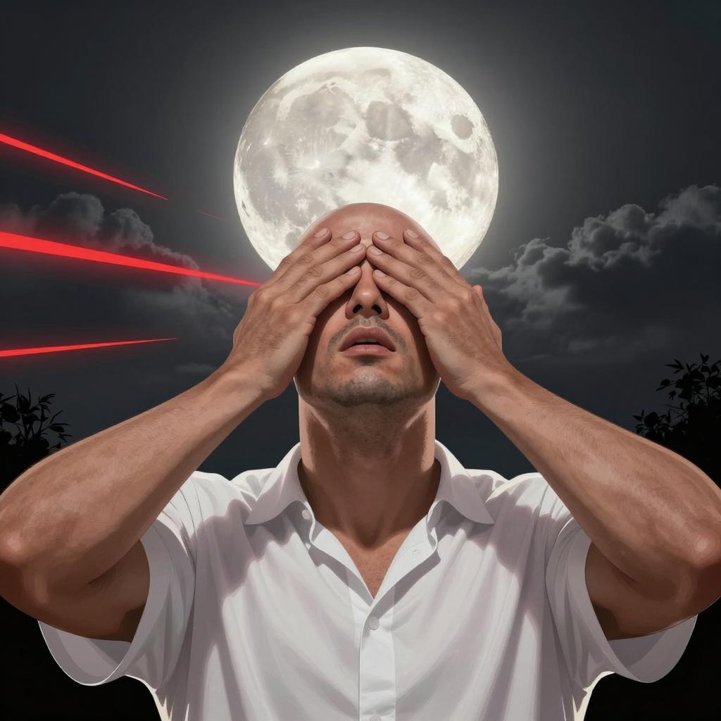 Illustration of a muscular man with a bald head, wearing a white shirt, covering his eyes with both hands. Bright full moon in the background, surrounded by dark clouds. Red light streaks across the left side. Man's head is tilted back, mouth slightly open. Man's skin is grayish, ure is rough.