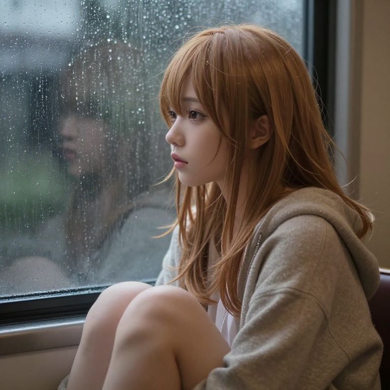 Light brown hair anime girl sitting by a window on a rainy day, raindrops sliding down the glass, cozy indoor setting with warm light, soft textures in clothing, reflective and thoughtful mood, detailed hair strands catching soft highlights.