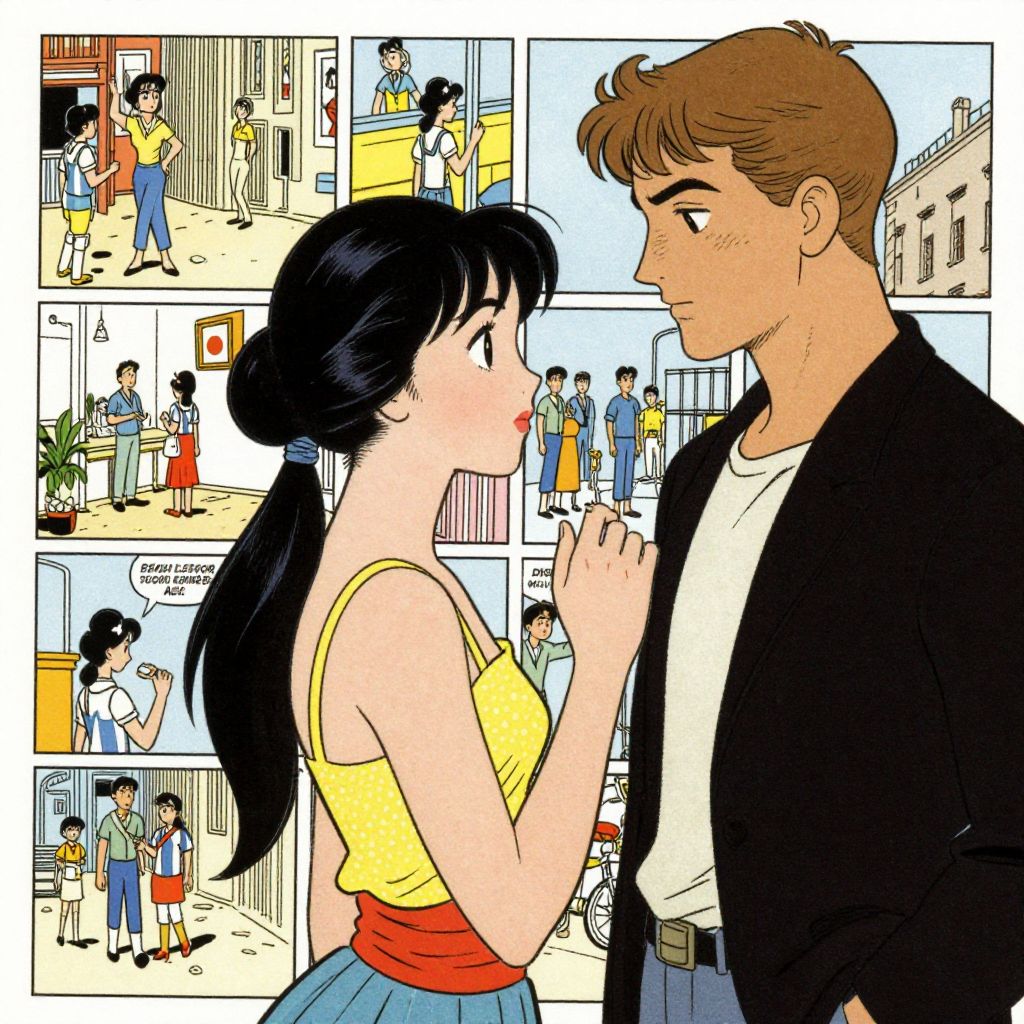 Body Art a young Japanese woman with her European boyfriend, found in a French or Belgian comic album, Hergé, Roger Leloup, Moebius,