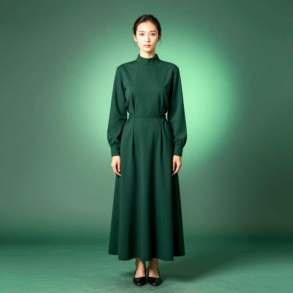 Full-body portrait of an Asian woman standing against a green gradient background. She is wearing a long dark green dress with a high collar, long sleeves, and cinched at the waist. Her hair is pulled back, and she wears black shoes. The image features minimalist studio lighting with a green light source behind her head, emphasizing the dress and neutral expression.
