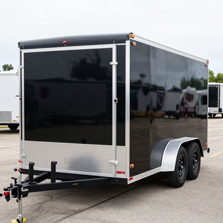 Stationary 2018 Freedom 8.5x20' enclosed car trailer with a 7000# GVW, featuring a sleek black exterior, diamond plate accents, and dual rear wheels, positioned outdoors on a paved lot with other trailers visible in the background.