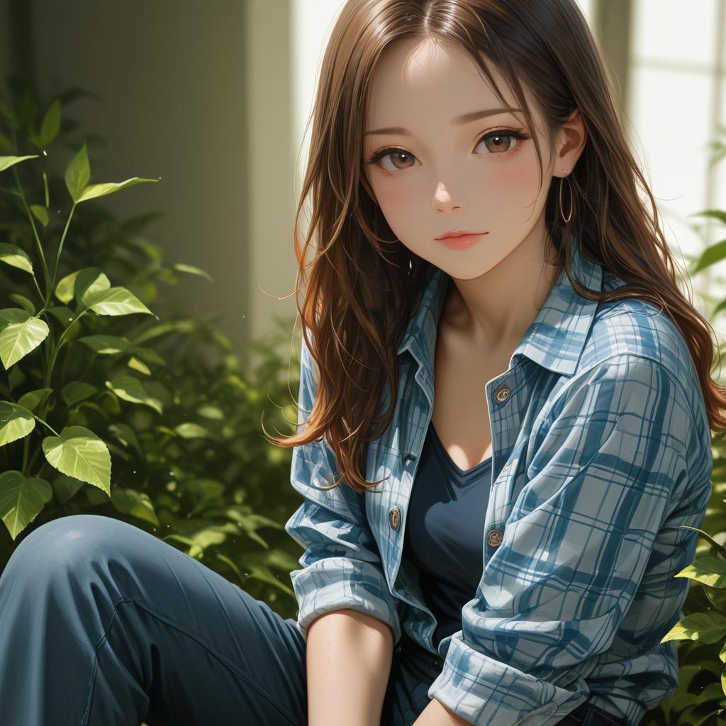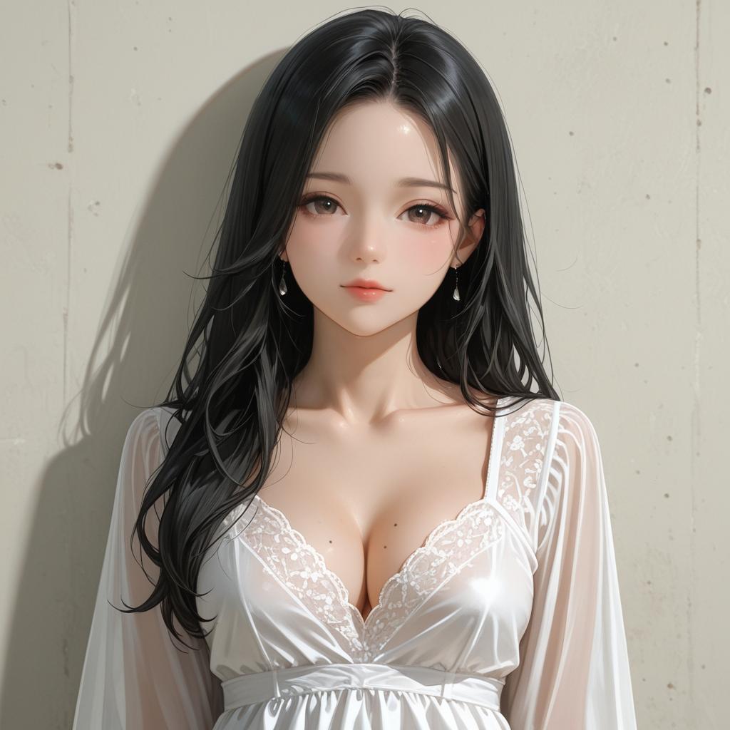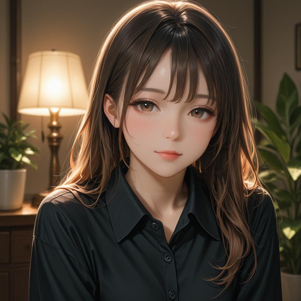 A photorealistic image of a young woman with long brown hair and black eyes, standing indoors in front of a window. She is wearing a sleeveless white dress with a black belt, bathed in warm sepia sunlight casting soft shadows. The woman is looking at the viewer with a closed mouth expression.